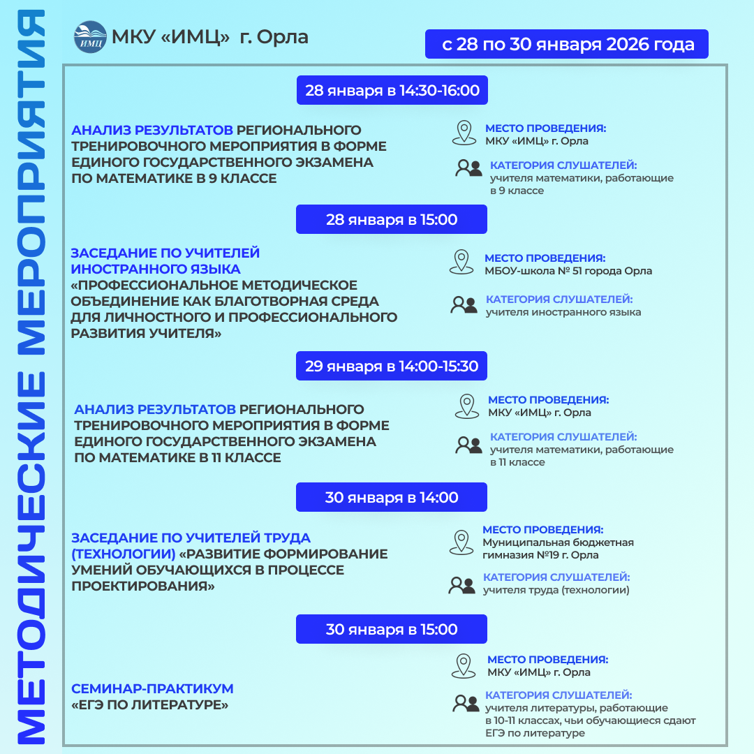 28,01.2026 г. на базе МКУ "ИМЦ" г. Орла состоялся семинар‑практикум для учителей математики, посвященный обсуждению результатов регионального тренировочного мероприятия в формате ОГЭ и ГВЭ по математике в 9 классах. В ходе мероприятия участники получили возможность проанализировать и обсудить основные ошибки, допущенные обучающимися.